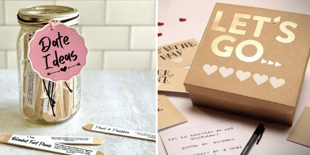 This one may also have you going to the craft store (or you can buy it online if you’d like). All you need is either a mason jar or any type of container that you can close and popsicle sticks, or instead you could use paper slips and make it into a card deck that you can fit inside of a box decorated by you. The only thing you have to do now is come up with a bunch of date ideas that you’d love to try with your loved one. Here is a list to even help you get started.
